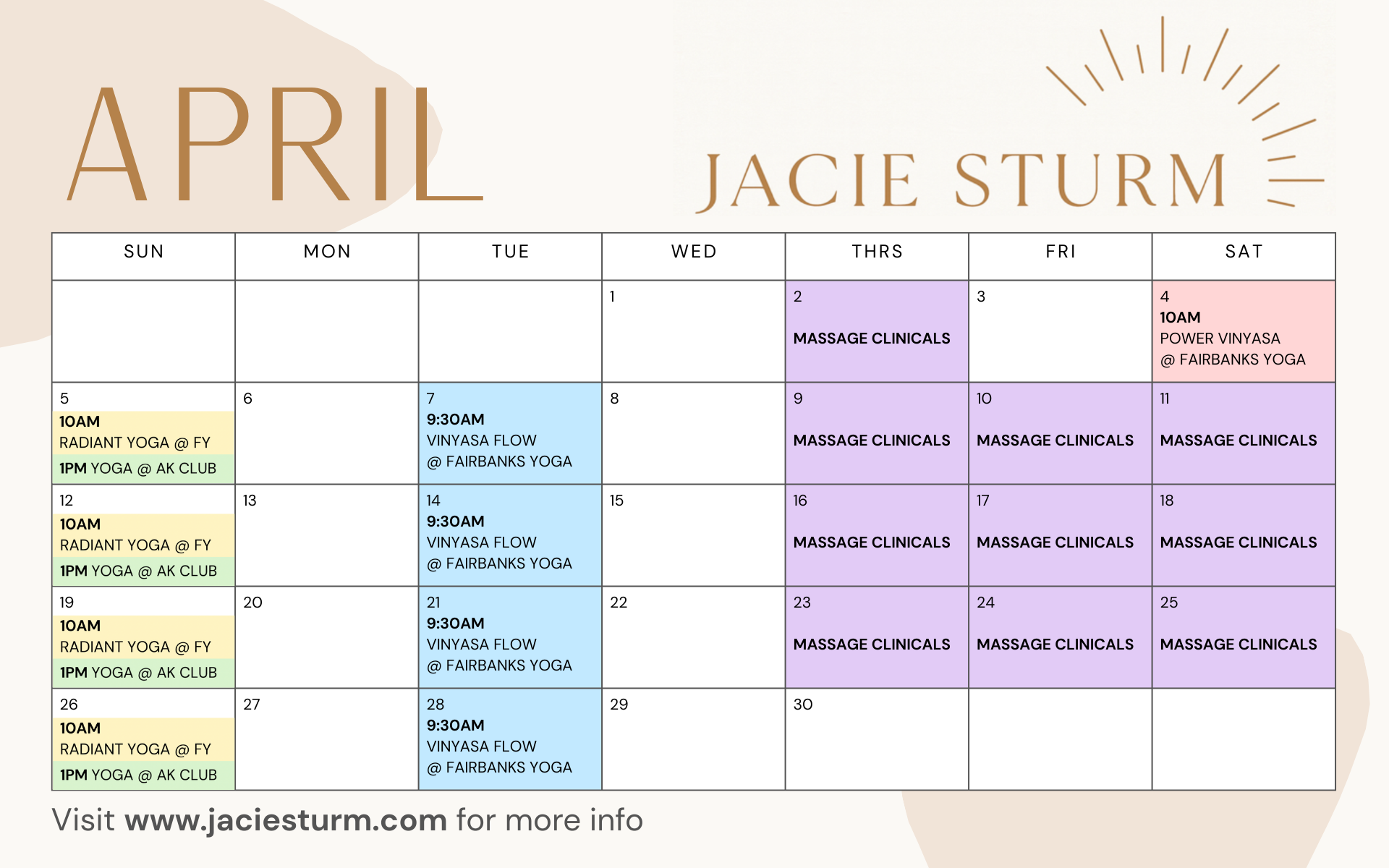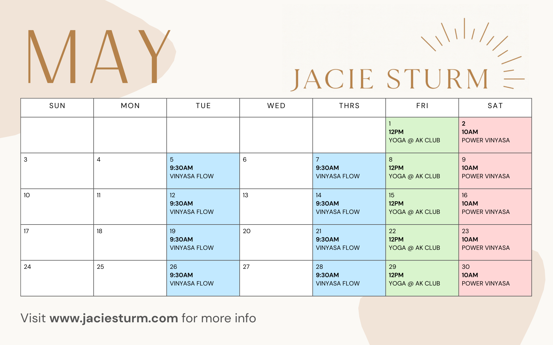 Class descriptions are listed below as well as a preview of my future monthly schedules at the bottom of the page (subject to change).